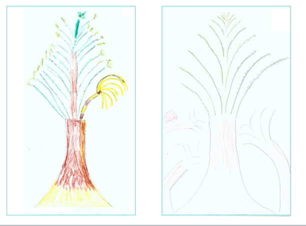בהשוואה בין העצים ניתן למצוא הבדלים רבים: עץ העבר קטן מתואר בקו חלש וקיים סימון של גזע וענפים בצבע חום. העץ א-סימטרי, הצמרת פתוחה ופרוצה והעץ תופס מקום קטן על הדף ש-¾ ממנו ריקים. שמש צהובה וקטנה נראית משמאל מעלה. עץ העתיד מתואר כגדול באמצעות כתמים. מלא בפירות ועלווה, מצויר כסימטרי (מאוזן) בעוצמה חזקה. העץ יוצא מגבולות הדף והוא מכוסה כולו ומוקף על ידי שמש ומלמד על השאיפה להתחזק ולצאת מתוך הסביבה המגבילה בה היא חיה.