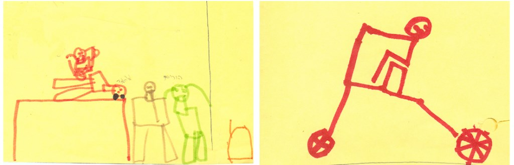 בהשוואה בין הציורים, בציור הראשון (מס' 7) מתואר ילד בודד על וספה. ציור זה מצויר בקו ראשוני וינקותי, הילד נראה כגולגולת ומסומן בקו רך. בציור האחרון (מס' 8) נראה ילד על מיטה, מוקף במשפחה ורופא, כשהילד שוכב בגובה עיני ההורים. מצוינים יותר פרטים בגוף הנפחי. הילד והרופא זהים בצבעם ובראש הילד מתוארות שתי עקיצות. נראה, שבשלב הראשון הילד מאשים את עצמו בהיווצרות המחלה, בעוד שבשלב השני הילד מגלה סלחנות בכך שהוא מאחד את עצמו עם החלק הריפויי ומסכים לקבל טיפול בתמיכת הוריו.