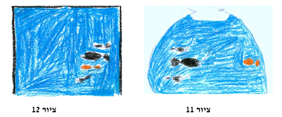 בהשוואה בין הציורים ישנו הבדל בין הציור הראשון (מס' 10) בו הדג הבודד והשונה מתואר בצבע כתום לעומת שאר הדגים השחורים ומעומת מולם והמיכל בעל צורה מעוגלת ופתח. בציור השני (מס' 11) הדגים מצטרפים לצד של הדג השונה והמיכל מרובע וממוסגר בקו שחור מודגש. העוצמה גדולה יותר והצביעה מוקפדת. ניתן להבין את המסגרת השחורה גם כהגנה, גם כהפרדה מהעולם וגם כאיום. יתכן, שהציור מבטא את הצורך להגן על הדג השונה שנמצא בחברת אחרים.