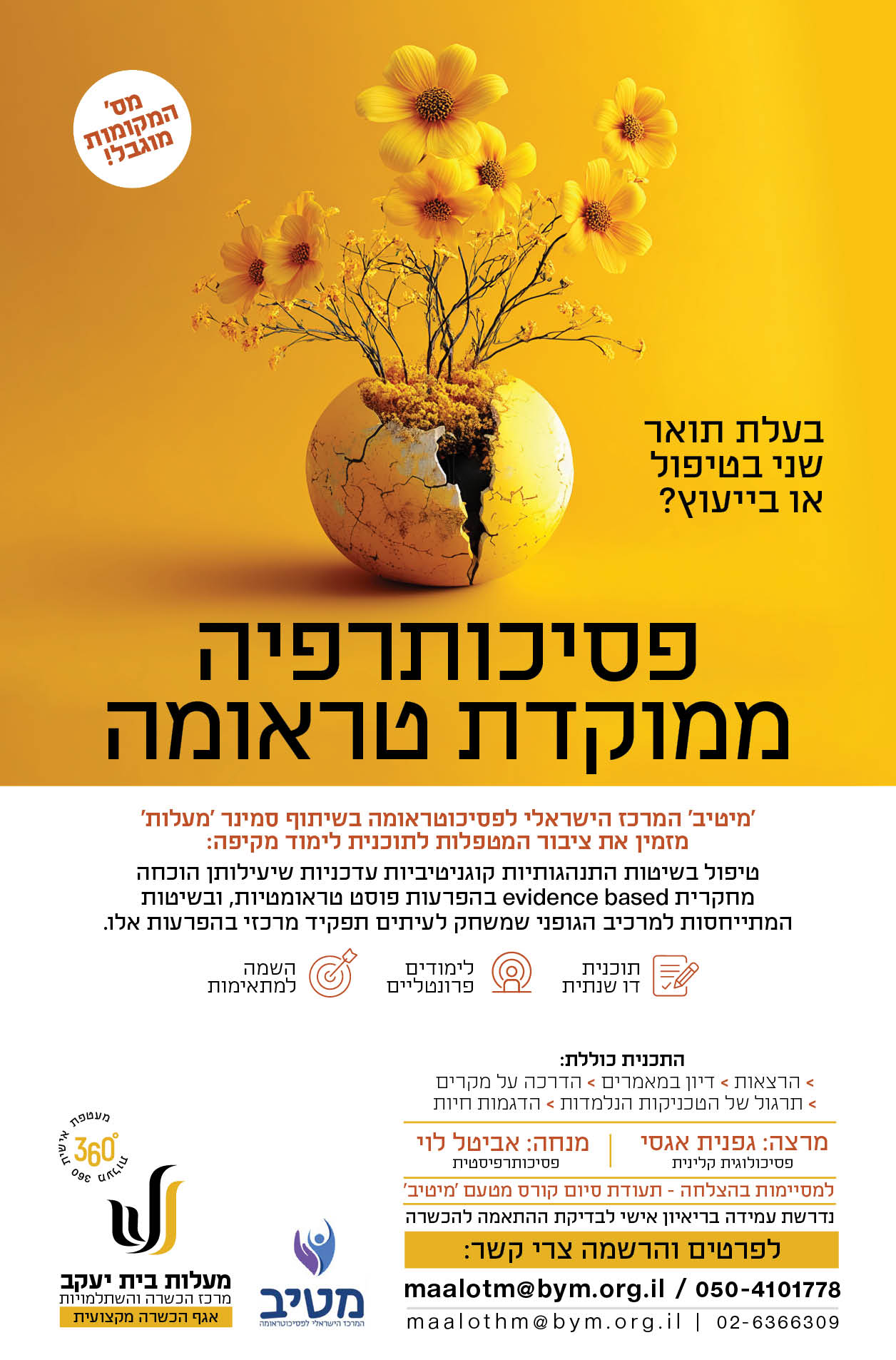 לבעלות תואר שני בטיפול וייעוץ- יסודות תאורטיים איתנים וכלים קליניים יישומיים לפיתוח מיומנויות טיפול בשיטות התנהגותיות קוגניטיביות עדכניות שהוכחו מחקרית כיעלות בהפרעות פוסט טראומטיות מורכבות.