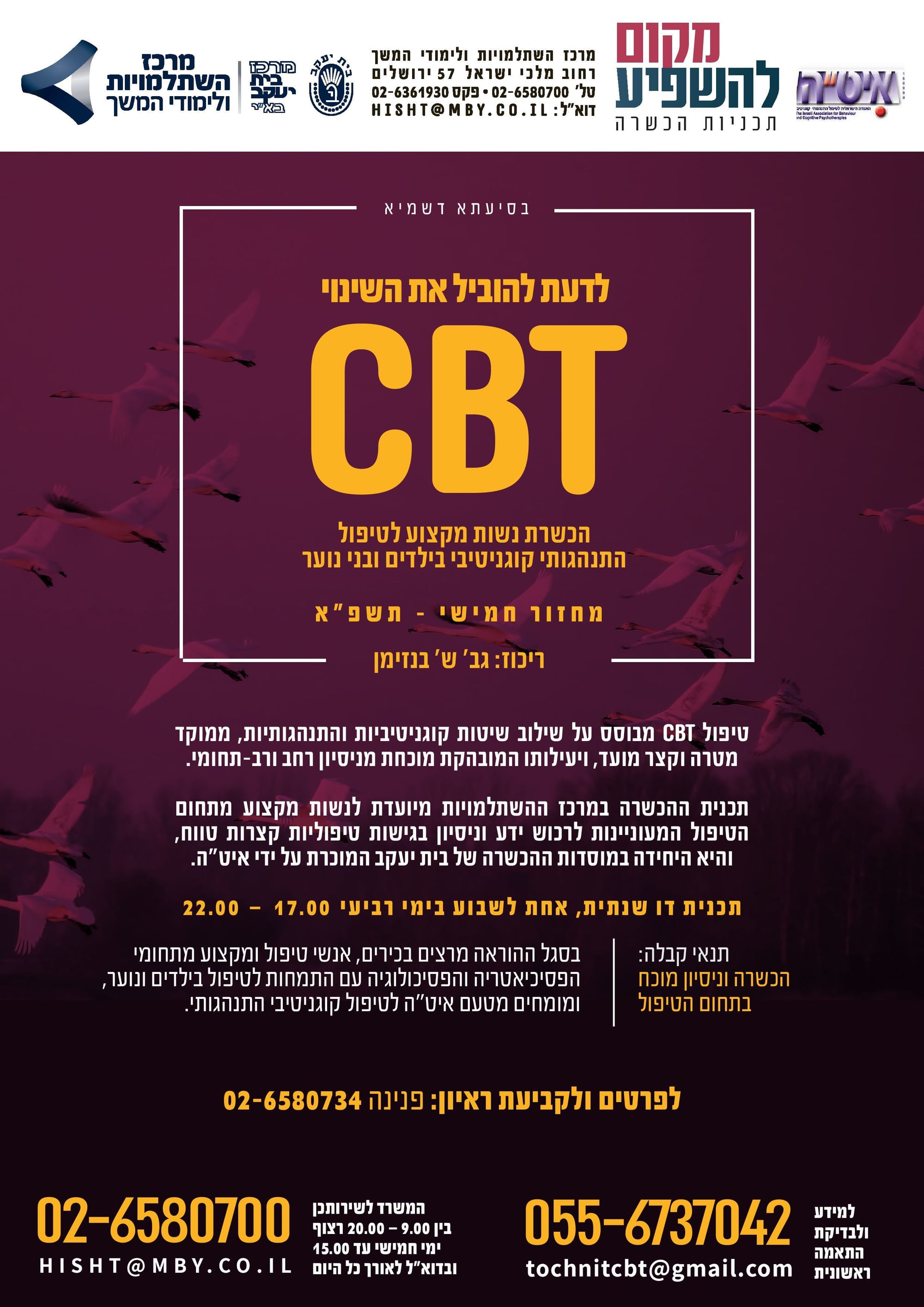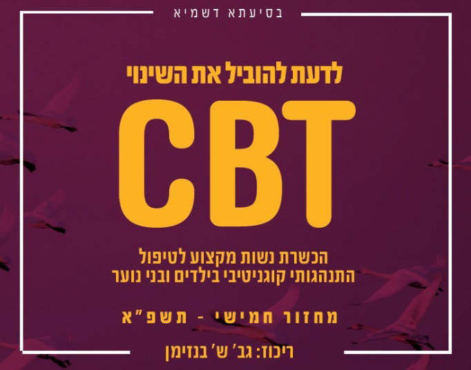 לאור ההצלחה הרבה- בשנת תשפ"א נפתח מחזור חמישי של לימודי C.B.T לנשות מקצוע בלבד. תכנית מקצועית, דו שנתית, יום לימוד אחד בשבוע בימי רביעי בערב. לכל הפרטים לחצי או גללי כאן למטה: