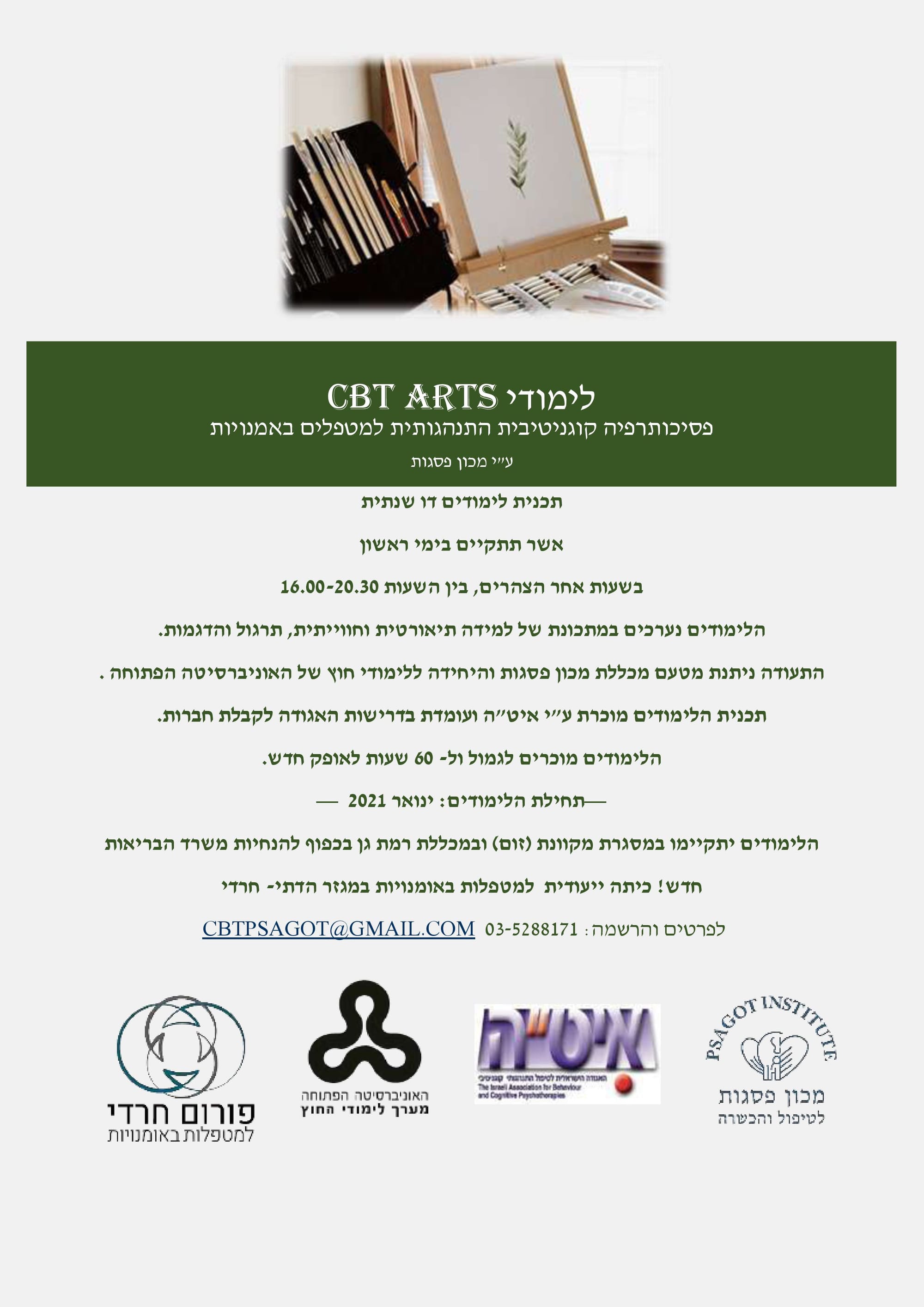 לימודי CBT ARTS למטפלות באומנויות מהמגזר הדתי- חרדי. תכנית לימודים דו שנתית הלימודים מוכרים כ- 60 ש"ש לאופק חדש. לכל הפרטים אודות התוכנית כנסו כאן או גללו מטה.